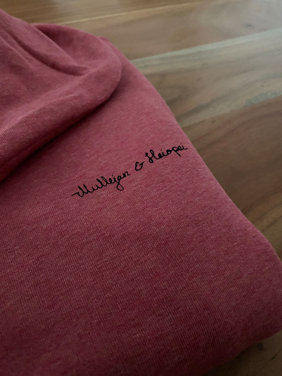 Das Highlight: der feine „Mullejan & Heiopei“-Siebdruck auf der Brust – ein liebevolles Detail, das zeigt, dass hier echte Originale unterwegs sind. In seinem warmen, leicht rosed red-Ton bringt der Hoody Farbe in graue Tage – fröhlich, aber nie kitschig. Einfach ein Teil, das immer passt.